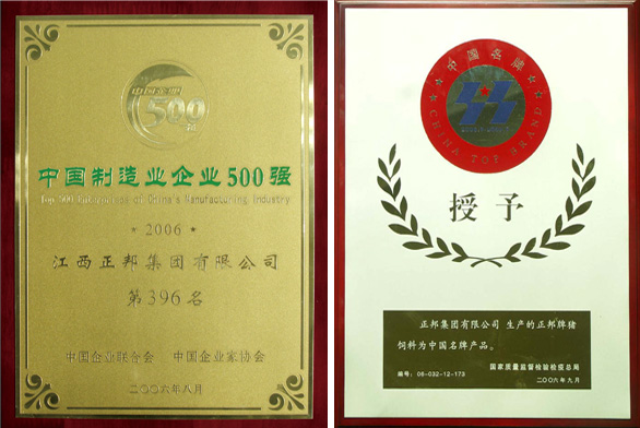 中国制造企业500强第396名; 正邦猪饲料成为中国名牌产品; 江西省原种猪场有限公司成立,正邦种猪育种步入专业化运营阶段。